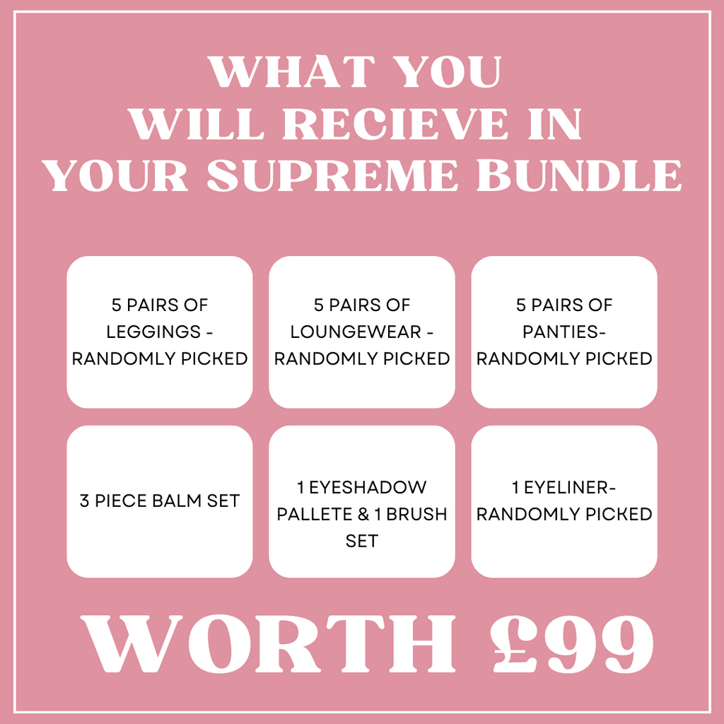You will only receive 5 Leggings,5Loungewears and 5 Ear Panties & 3pc Lip Balm Set ,1 Eyeliner,1 Eyeshadow Pallete,